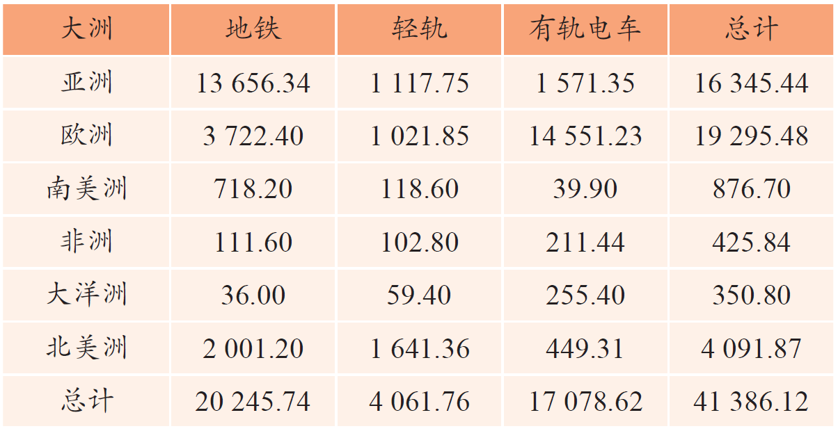 Ipinapakita ng Figure 1 ang pangkalahatang sukat ng transit ng riles ng lunsod sa mga pangunahing kontinente sa mundo (tandaan: ang lahat ng mga lungsod sa Russia ay inuri sa Europa para sa pagkalkula). Ipinapahiwatig ng data na ang mga subway at tram ay ang mga pangunahing uri ng lunsod o bayan na transit sa riles sa buong mundo, at ang pandaigdigang transit ng riles ng lunsod ay pangunahing puro sa Eurasia, na may mga subway na pangunahing ipinamamahagi sa mga bansang Asyano. [1]
