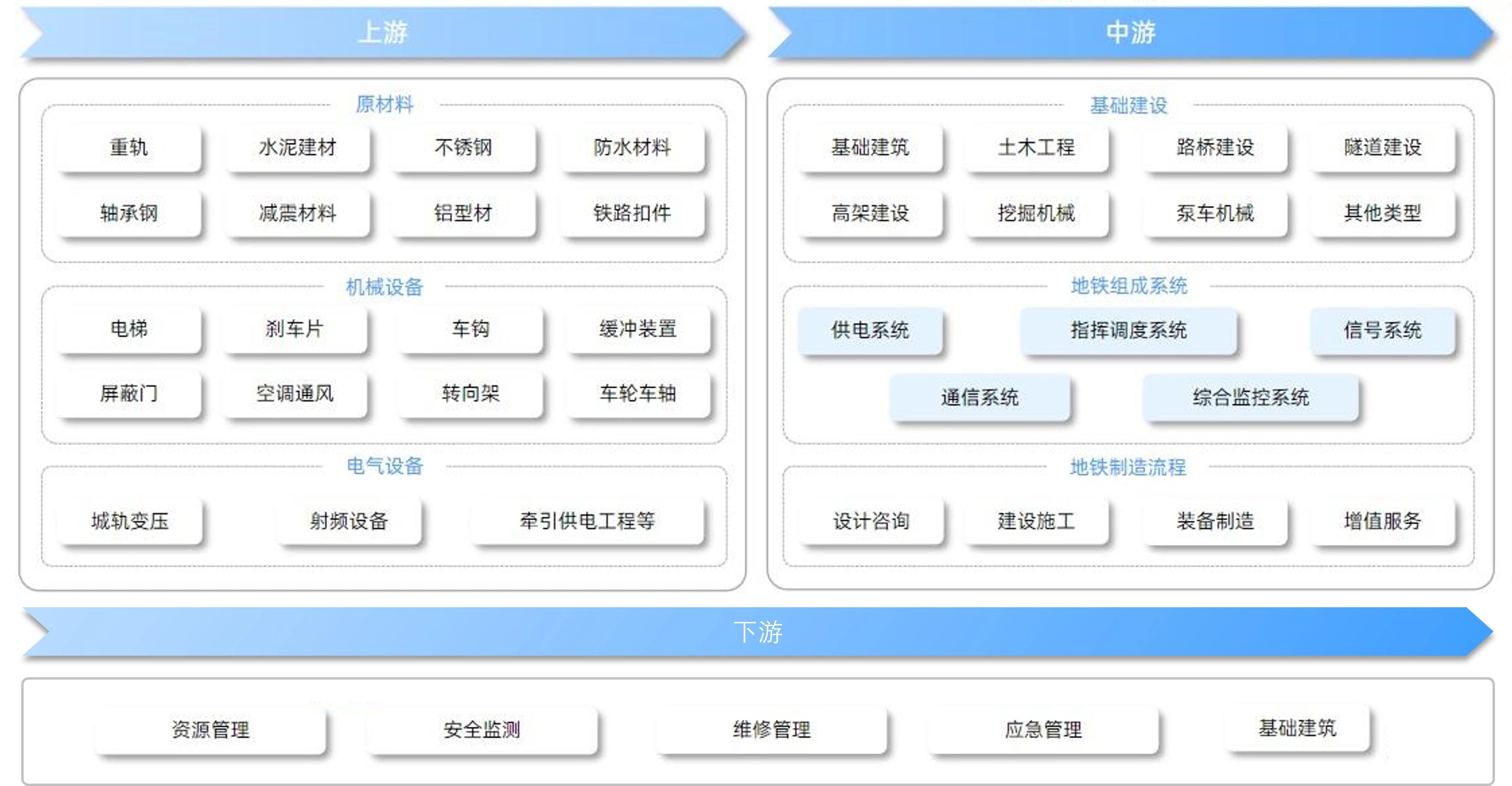 Kinokonekta ng Rail Transit ang mga industriya ng lunsod, nagtataguyod ng pagpapalawak ng pang -industriya na kadena, at nagtutulak ng mabilis na pag -unlad ng pagsuporta sa mga industriya tulad ng paggawa ng kagamitan at teknolohikal na R&D. Ang kadena ng industriya ng subway ay ipinapakita sa Figure 3, kung saan ang lahat ng mga link ay umaasa at hinihimok ang pag -unlad ng ekonomiya ng mga agglomerasyon ng lunsod at mga lugar ng metropolitan. [2]