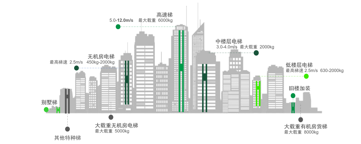 Nag-aalok kami ng malawak na hanay ng mga traction machine at tumutugmang mainframe, na angkop para sa mga sitwasyon ng aplikasyon na may maximum load capacity na 6000kg (2:1 ratio) at maximum na bilis na 12m/s (1:1 ratio). Ang mga customer ay maaaring direktang pumili ng mga angkop na modelo batay sa mga parameter ng elevator, na makabuluhang nagpapaikli sa ikot ng disenyo.
