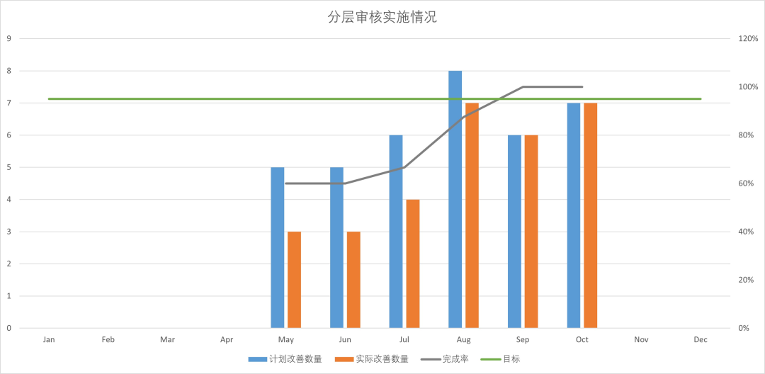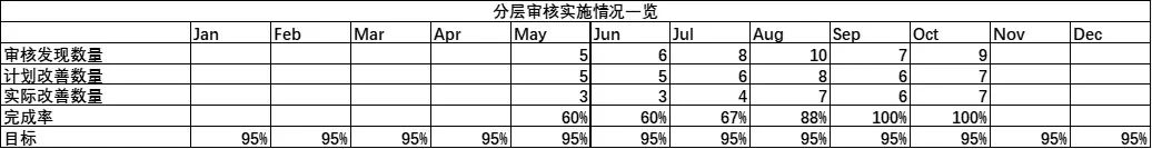 Malawak ang nilalaman ng mga layered na proseso ng pag -audit. Upang masubaybayan ang kahusayan at kalidad ng mga pag -audit, ang aktwal na pagpapatupad ng LPA ay ipinapakita sa paraang katulad ng isang dashboard. Kasama sa ipinapakita na nilalaman: ang rate ng pagkumpleto ng pagpapatupad, ang bilang ng mga natuklasan sa pag -audit, ang rate ng pagkumpleto ng mga pagpapabuti, atbp.