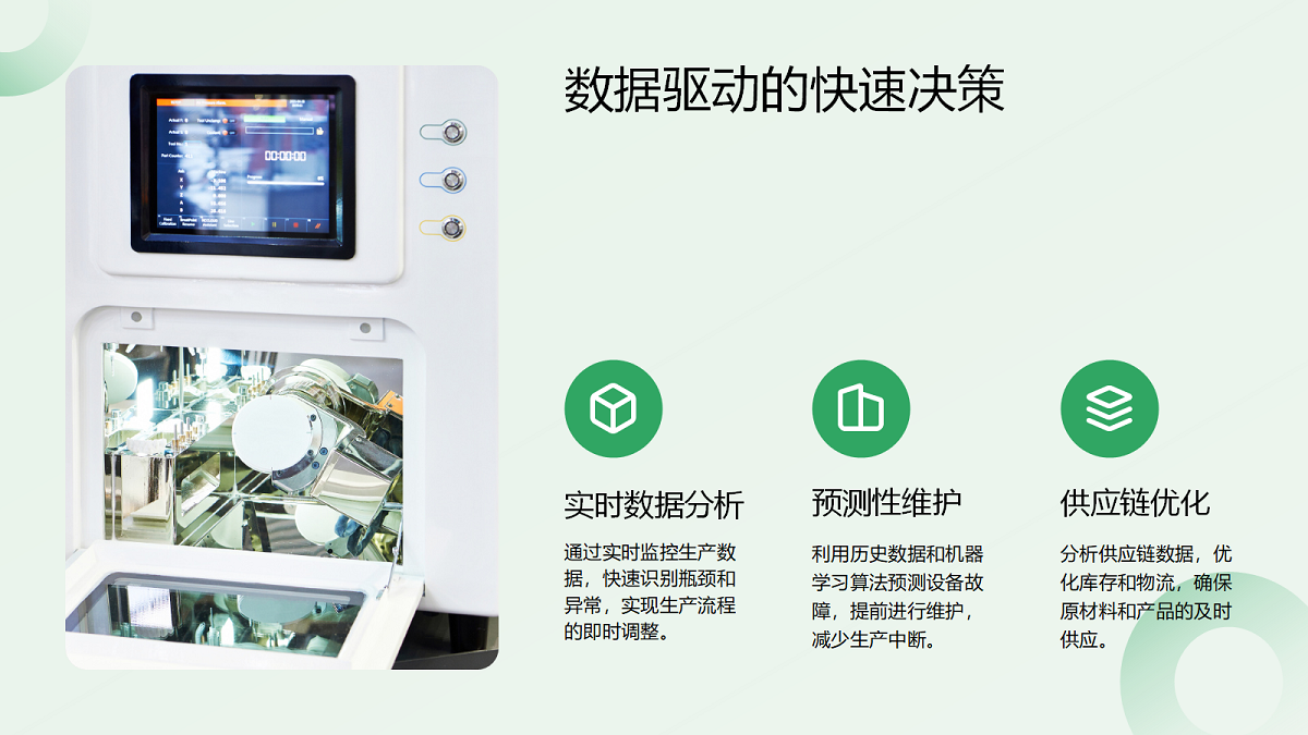 • Ang mabilis na paggawa ng desisyon ng data: gumawa ng mabilis na mga desisyon sa pagtugon sa pamamagitan ng pagsusuri ng data ng real-time, mahuhulaan na pagpapanatili, at pag-optimize ng chain chain.